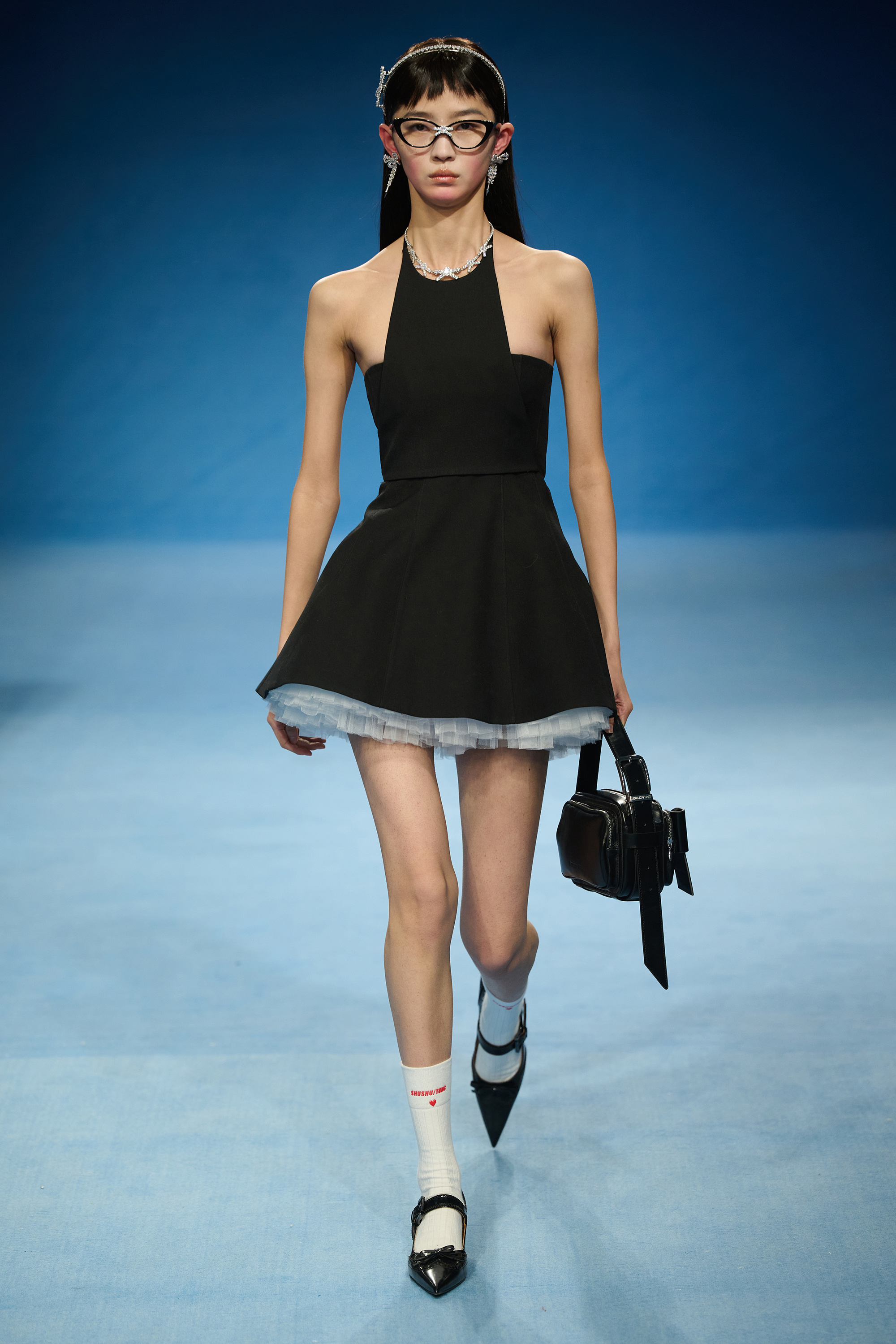 所有造型都是一望而识的SHUSHU/TONG风格。少女洛丽塔般的发型搭配青涩的黑框眼镜,荷叶边、圆领、蕾丝和褶皱都再次出现在了秀场上。但和此前数个季度鬼马的风格不同,此次两位设计师的态度更为严肃,大量服饰的廓形都围绕着制服展开,其中的成熟感和细节上的少女感形成了明显的冲突。
