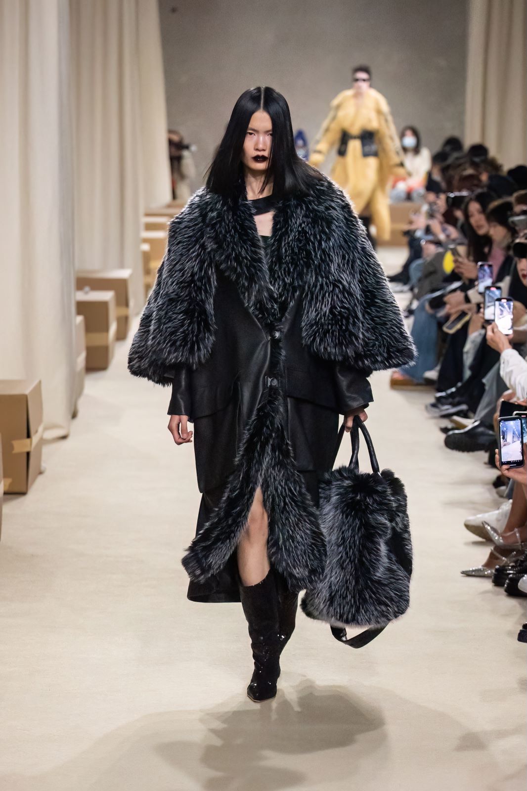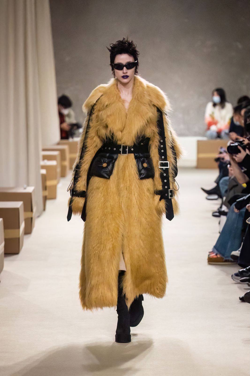 在最新的2023秋冬系列中,Jarel Zhang毫不吝啬地让大量皮草贯穿整场时装秀。明亮温暖的黄色皮草大衣是和带有朋克风格的搭扣链条搭配,酷感十足的黑色皮毛被嵌在肩部和下摆。在另一则造型中,皮草又作为裙装的主导面料,和立挺的拼色上装搭配,别出心裁。