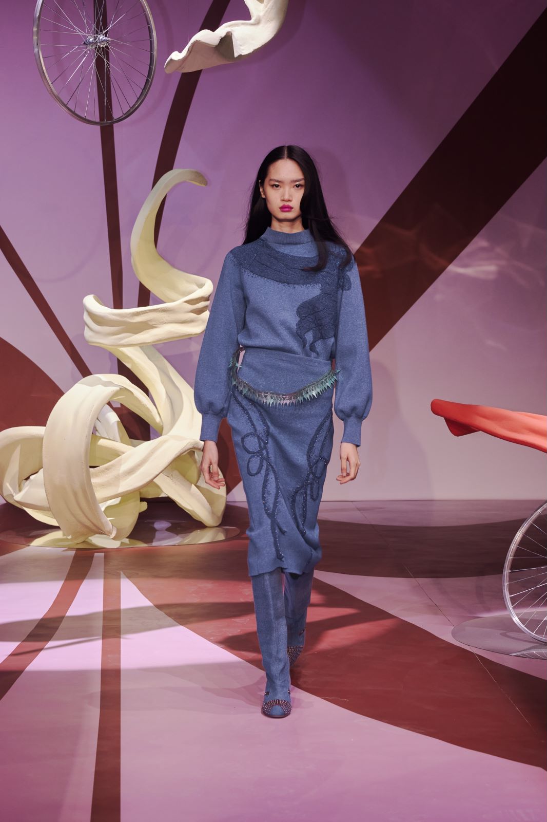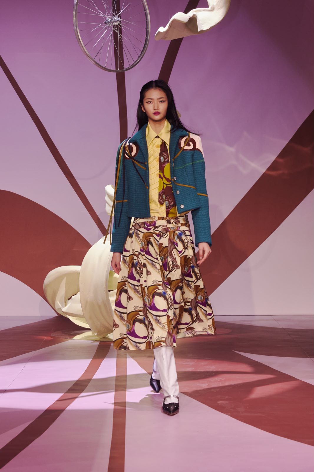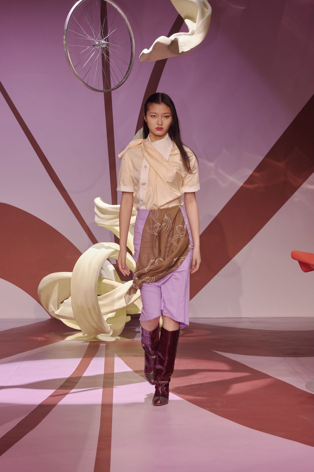 细节也同样有趣。一件有着毛毡质感的外套上绣着花卉,与之搭配的是一条拼接着紫色和棕色的及膝裙装。被用作回应主题意象的领带以交叠形式和上衣融为一体,展现出迷人的柔和褶皱观感,而各色及膝长靴则带来了利落的酷感。