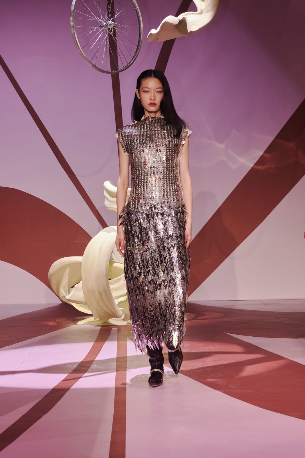 而那些被引用的戏剧包含了《十七岁的单车》和《林冲夜奔》,前者主角小贵胸前摇曳的领带被呈现在模特身上,后者的代表则是凛冽飘扬的衣襟。镭射切割和针织技法交叠让面料对比出强烈的戏剧感,绚丽的金属色泽有着舞台专属的华丽属性。