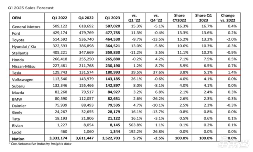 另外,在考克斯的汽车销量数据统计表中发现,特斯拉的汽车销量同比增长39.5%,比2022年第四季度增长了37.6%。