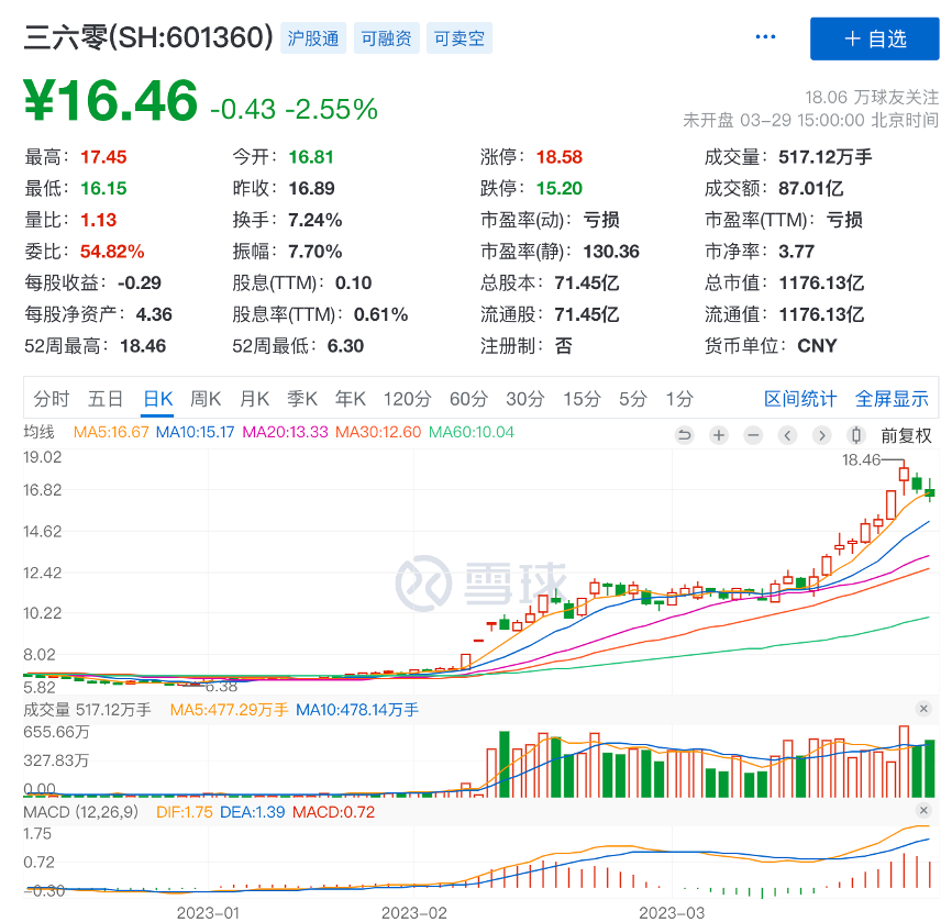 数据显示,从今年的2月初chatGPT开始在国内大范围地受到关注之后,360的股价从最低点的6.3元左右开始连续上涨,目前的股价为16.5元每股,涨幅超过160%,市值再次超1000亿元。