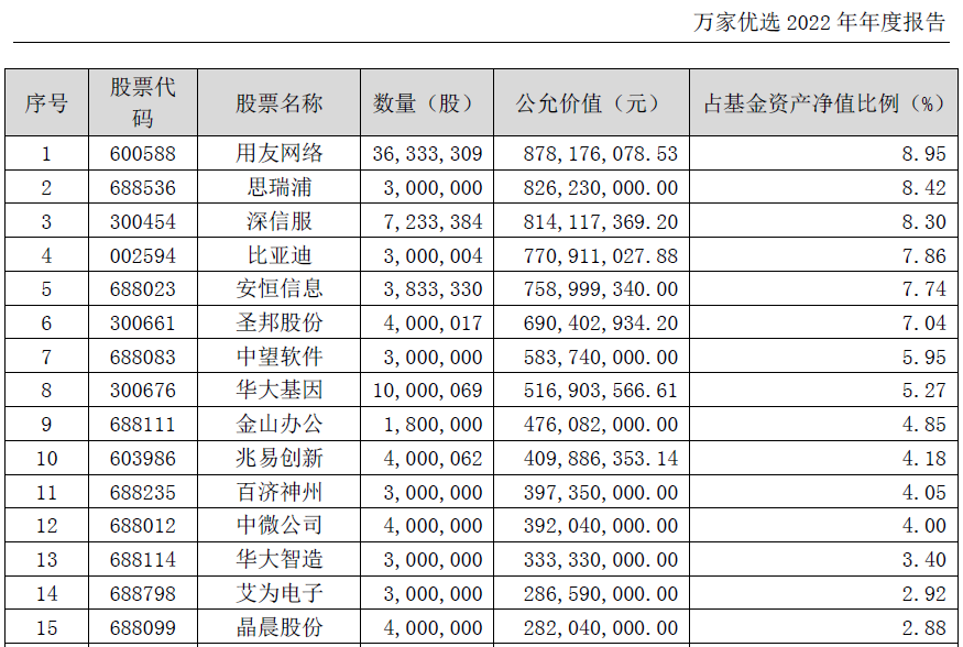 2022年末,万家优选股票持仓金额占基金总资产的比例为92.76%。基金前十大重仓股占净值比例为68.56%,明显高于同类平均的45.13%。