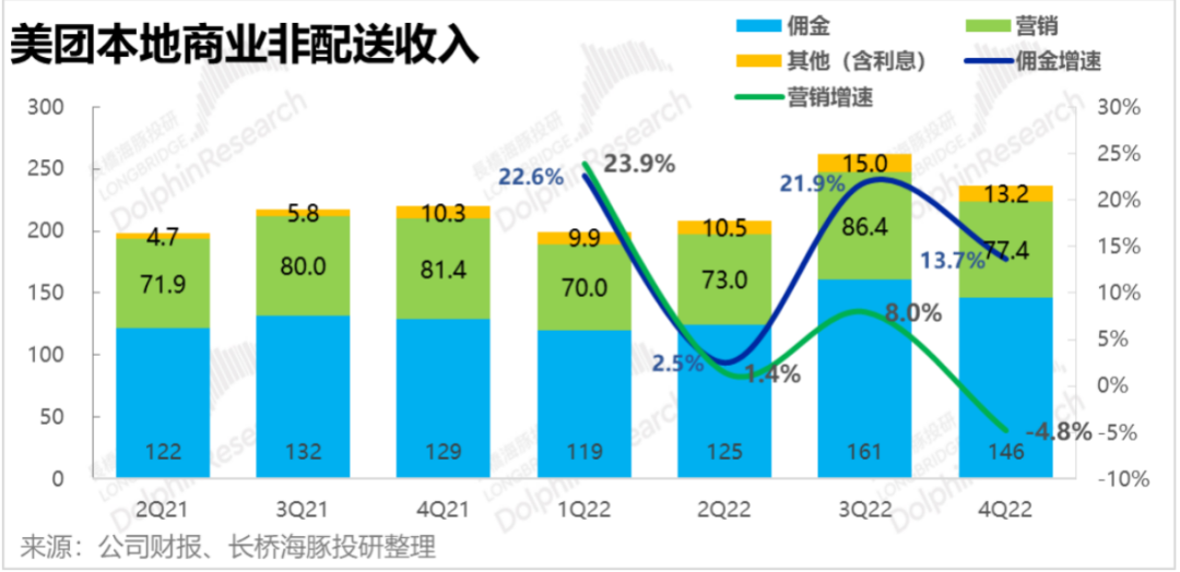 具体到财务数据,四季度美团的佣金收入为146亿元,同比增长13.7%,增速与订单量增长基本匹配。广告营销收入却只有77.4亿元,同比下降4.8%,表现差强人意。哪怕是封城的Q2,增速还有1.4%,解封的Q4增速已经下滑到-4.8%。