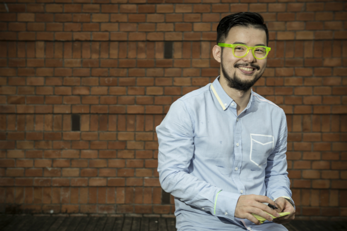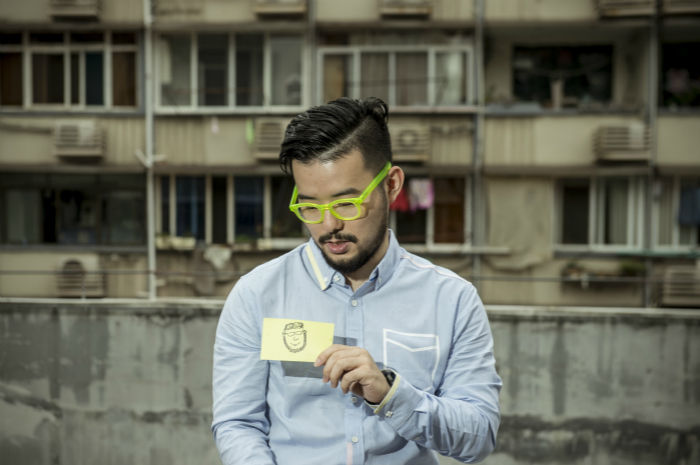 李盛弘乖乖地接受摄影师的指示,在镜头前摆出各种姿势,腼腆中带着一丝僵硬,显然还未习惯成为闪光灯下的焦点。在摄影师要求拿一个东西出来表明自己的设计师身份时,他略想了想,在一张便利贴上很利落地画了个漫画头像,笔触简单,但显然就是他自己。在他画画的时候,摄影师迅速按下快门,之前的局促感消影无踪。