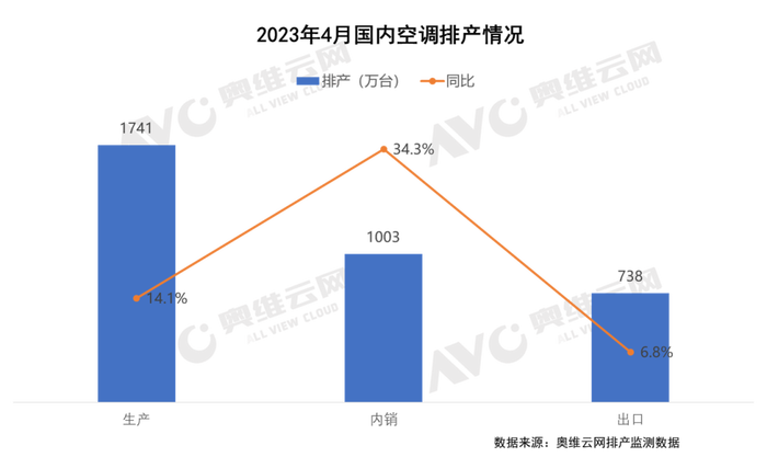 继3月份高增长后,4月份国内空调排产仍持续高增长。据奥维云网(AVC)数据显示,4月国内空调总排产1741万台,其中内销排产1003万台,同比增长34.3%,出口排产738万台,同比增长6.8%。