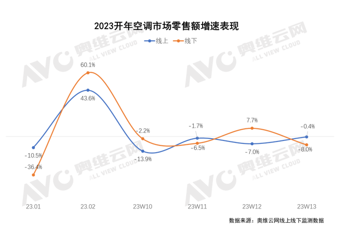 不论是厂商还是渠道商的预期如何好,生产备货如何积极,市场表现还是要看终端消费者的需求情况。1、2月数据来看,空调零售无论是线上、线下都实现了不错的增长。然而,进入3月后,增长势头急转直下:根据奥维云网(AVC)监测数据,23W10-13(2.27-3.26),空调线上连续4周负增长。