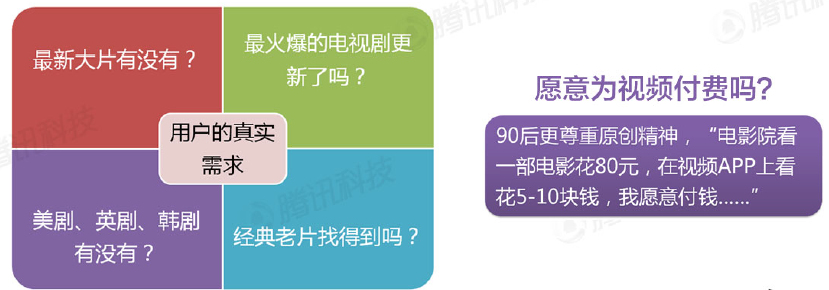 以上是腾讯做的一个调研,从结果来看,90后似乎更喜欢流行的内容,比如目前正在热映的大片、大家都在热追的电视剧,以及新出的海外剧等,并且愿意为这些内容付费。
