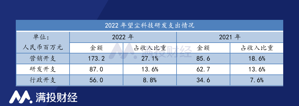 从费用端来看,2022年全年,望尘科技整体的费用支出达到3.16亿元,占收入比重从去年的39.80%提升至今年的49.60%,整体占比规模提升明显。营销开支、研发开支、行政开支的金额分别为1.73亿元、5600万元、8700万元,占收入比重较去年均有所提升。