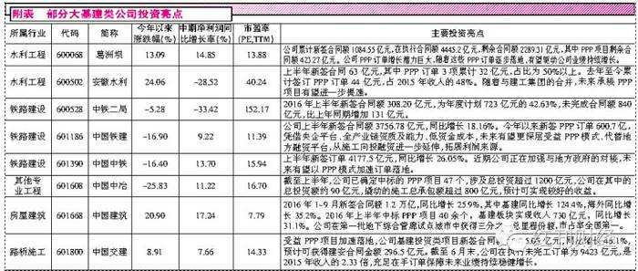 随着第三批示范项目公布,基建行情再次被燃起,国庆假期后,基建大蓝筹成为市场中为数不多的亮点之一,中国铁建、中国中铁、中铁二局等个股放量上涨。业内人士分析加之三季报正相继出炉,PPP行情之风再次刮起,目前大建筑国企2016年订单较多出现大幅增长且目前为历史上最好的盈利期,其业绩将可能出现超预期兑现。