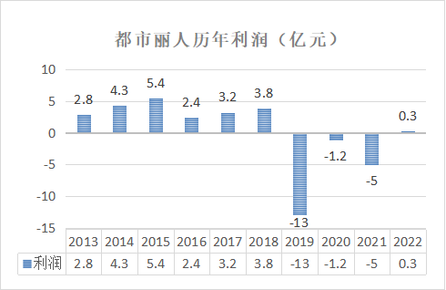 过度依赖线下渠道,导致都市丽人营收结构脆弱,在2019、2020、2021疫情期间,连续亏损。尤其是2019,亏损了近13亿。从2022年的表现来看,还是没有缓过来。