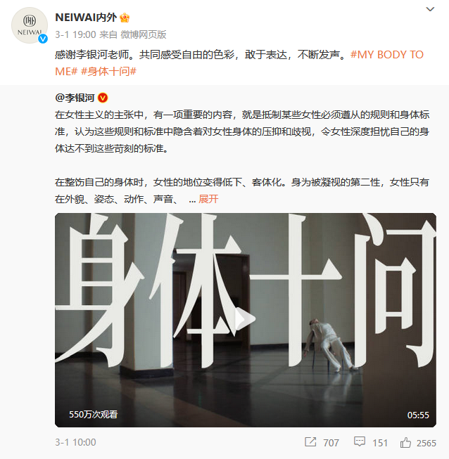今年妇女节,主打“无尺码内衣”的品牌“内外”,凭借一段极具张力、表现力的舞蹈视频,成功营销追求平等自由、身体解放的女性消费者。