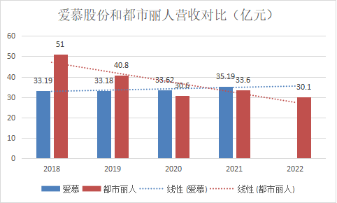 从营收趋势来看,都市丽人是下滑态势,最开始的领先优势不再,而爱慕股份是处于较为缓慢的稳定增长,并且在2021年赶超,目前2022年的财报还未公布。