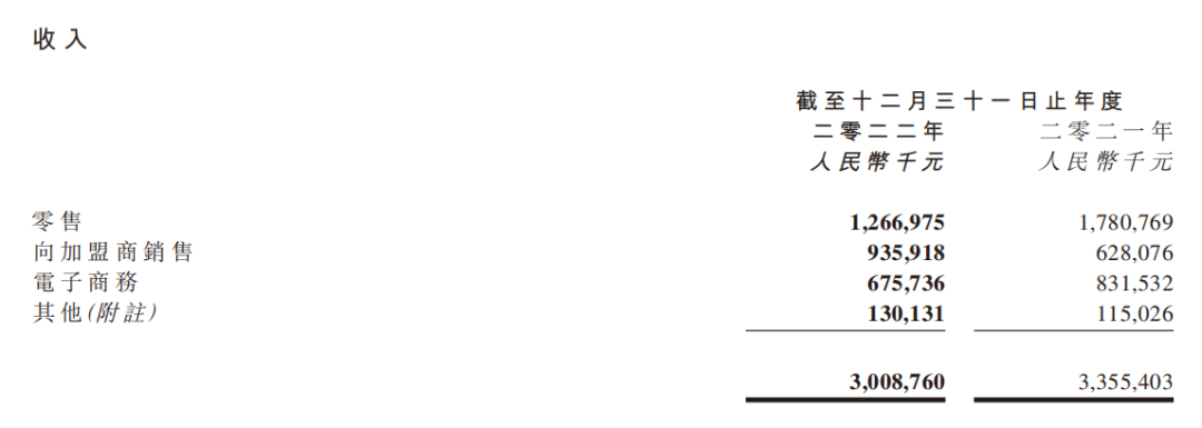 具体来看营收数据,可以看到,除了“其他”和“加盟商销售”外,零售和电子商务同比2021,都在下滑。