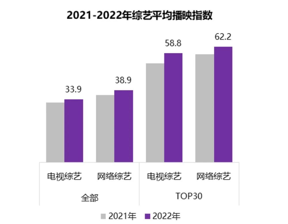 时至今日,“观众不爱讨论综艺”已成为该行业最致命的问题。其实近年来,综艺在播映数据上表现得并不差。艺恩数据刚发布的《2022综艺市场及赞助研究报告》就指出,“2022年综艺的整体播映指数均值、头部综艺播映指数均值都有上涨”。