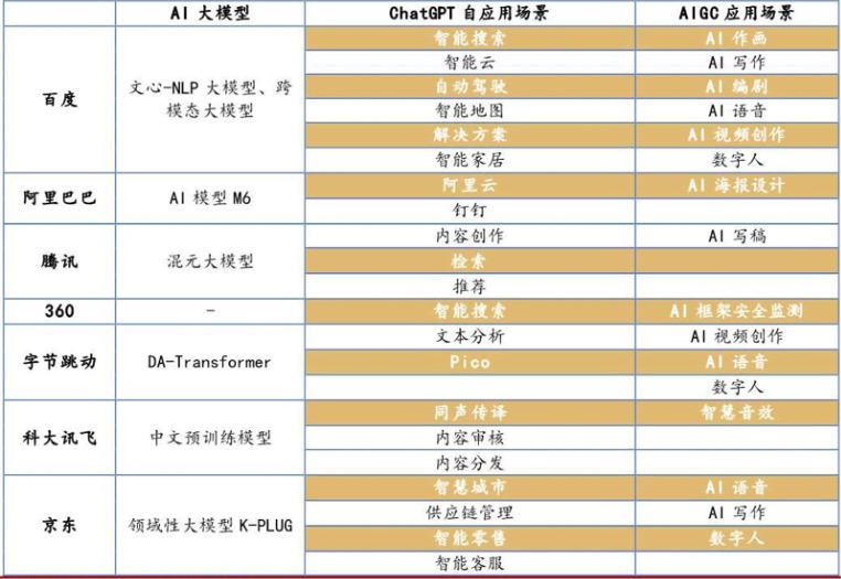 目前看来,虽然大厂都有布局,但是大家的方向并不一样。根据华西证券研究所这张图,可以看到,各个互联网大厂还是基于自己的应用场景在做布局。