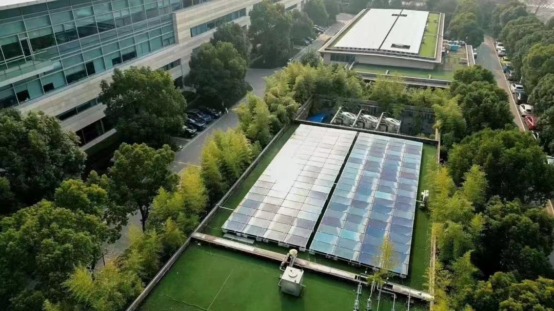 “园区建筑屋顶、车棚顶面,甚至湖面都得到了最充分的利用,大面积铺设光伏及钙钛矿黑科技组件,总功率超500kW;另有400kW功率生物质天然气分布式能源,采用园区餐厨垃圾生物质天然气供给绿电。”牛曙斌表示,与此同时,湖底埋着的800根换热管每年可节约360万kWh电能,再加上200kWh智能调控的储能系统及高效LED照明,建筑整体节能效果可超过60%。