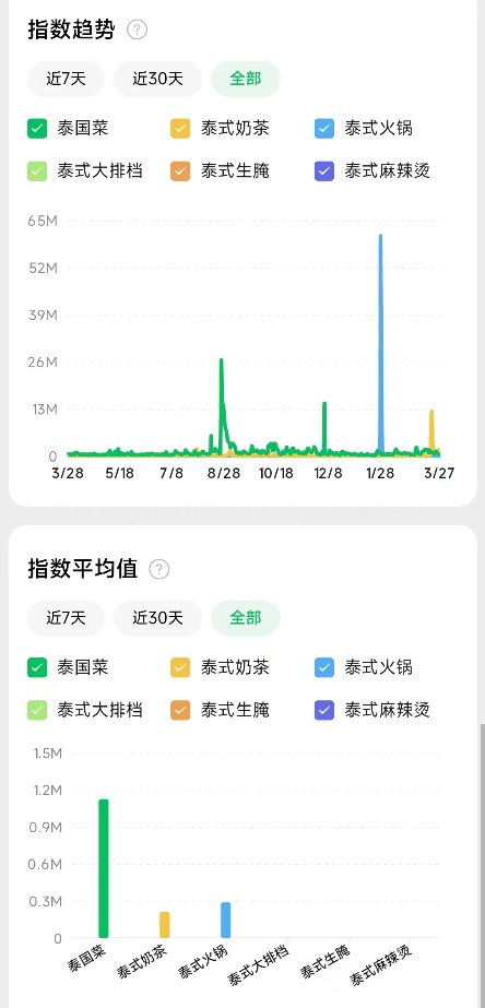值得一提的是,“泰式咖啡”暂未被收录,而热度搜索除了泰国菜呈现了多个周期,其它的小类基本只有一个高峰期,而且这个高峰期很虚,来得快去得更快。