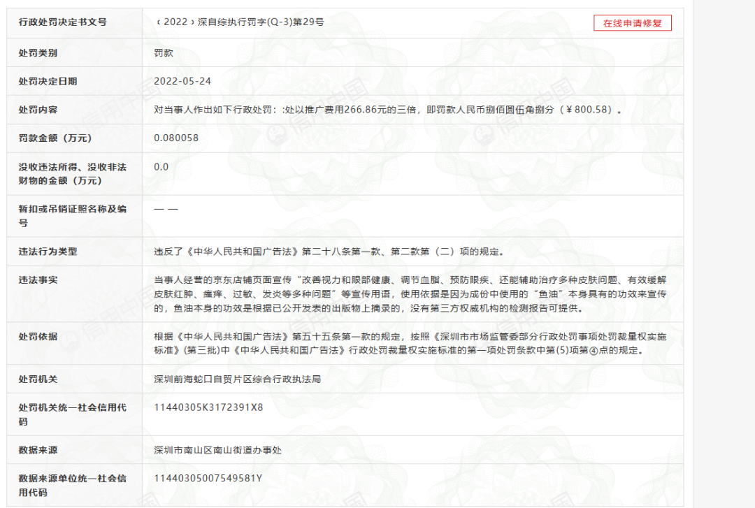 具体事由为,沃森贸易经营的京东店铺页面使用“改善视力和眼部健康、调节血脂、预防眼疾、还能辅助治疗多种皮肤问题、有效缓解皮肤红肿、瘙痒、过敏、发炎等多种问题”等宣传用语,使用依据是因为成份中使用的“鱼油”本身具有的功效来宣传的,鱼油本身的功效是根据已公开发表的出版物上摘录的,没有第三方权威机构的检测报告可提供。