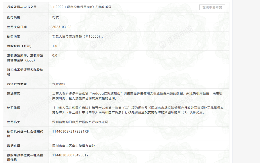 3月29日,《宠业光年》自信用中国网获悉,深圳市沃森贸易有限公司(简称“沃森贸易”)被行政处罚,被罚款1万元,违法事实为:当事人在拼多多平台店铺“reddog红狗旗舰店”销售商品详情使用无权威依据来源的数据,未准确引用数据,未表明数据出处,且无法提供证明其真实性的证明。