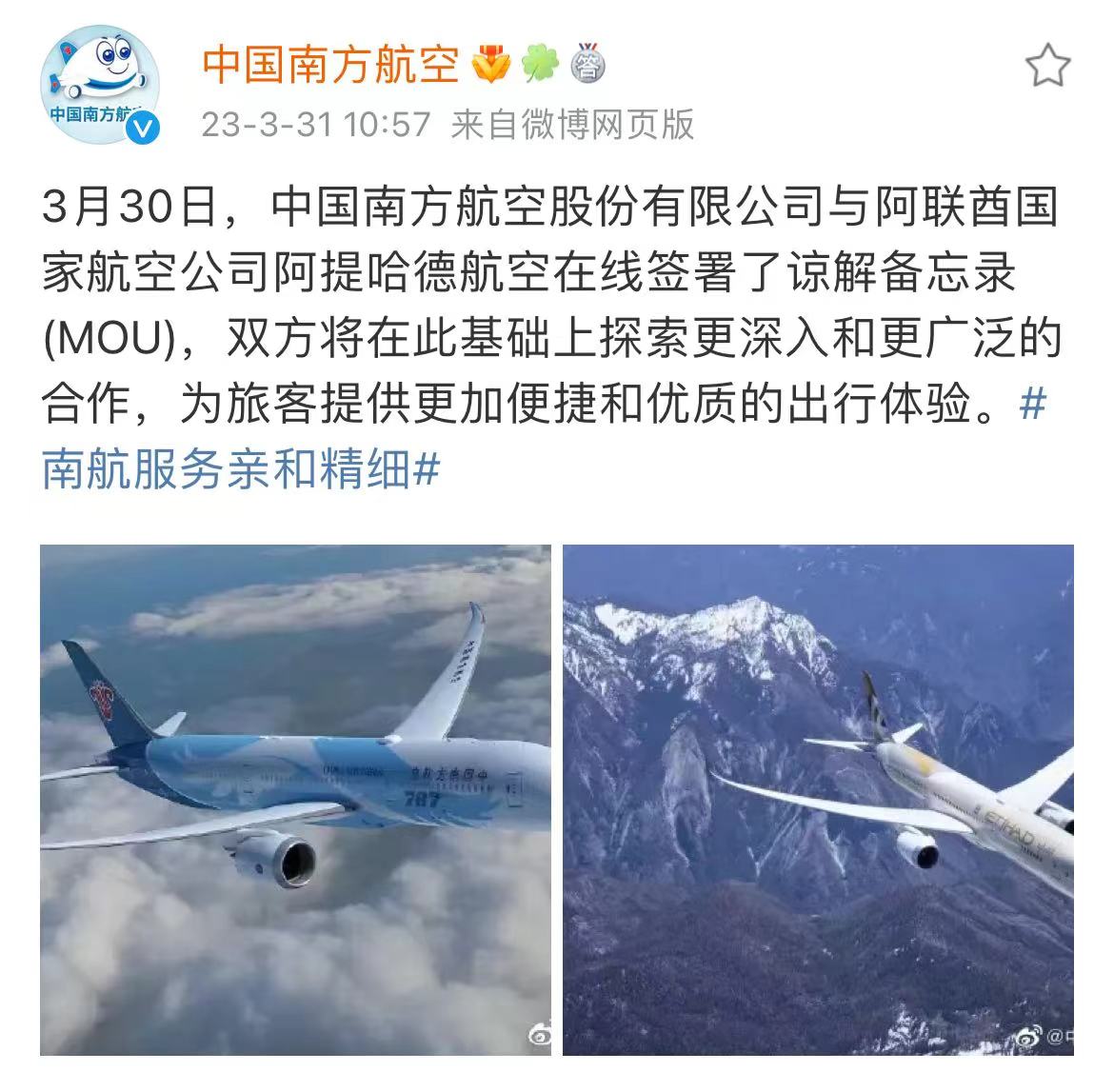 据@中国南方航空 微博消息,3月30日,中国南方航空股份有限公司与阿联酋国家航空公司阿提哈德航空在线签署了谅解备忘录(MOU),双方将在此基础上探索更深入和更广泛的合作,为旅客提供更加便捷和优质的出行体验。