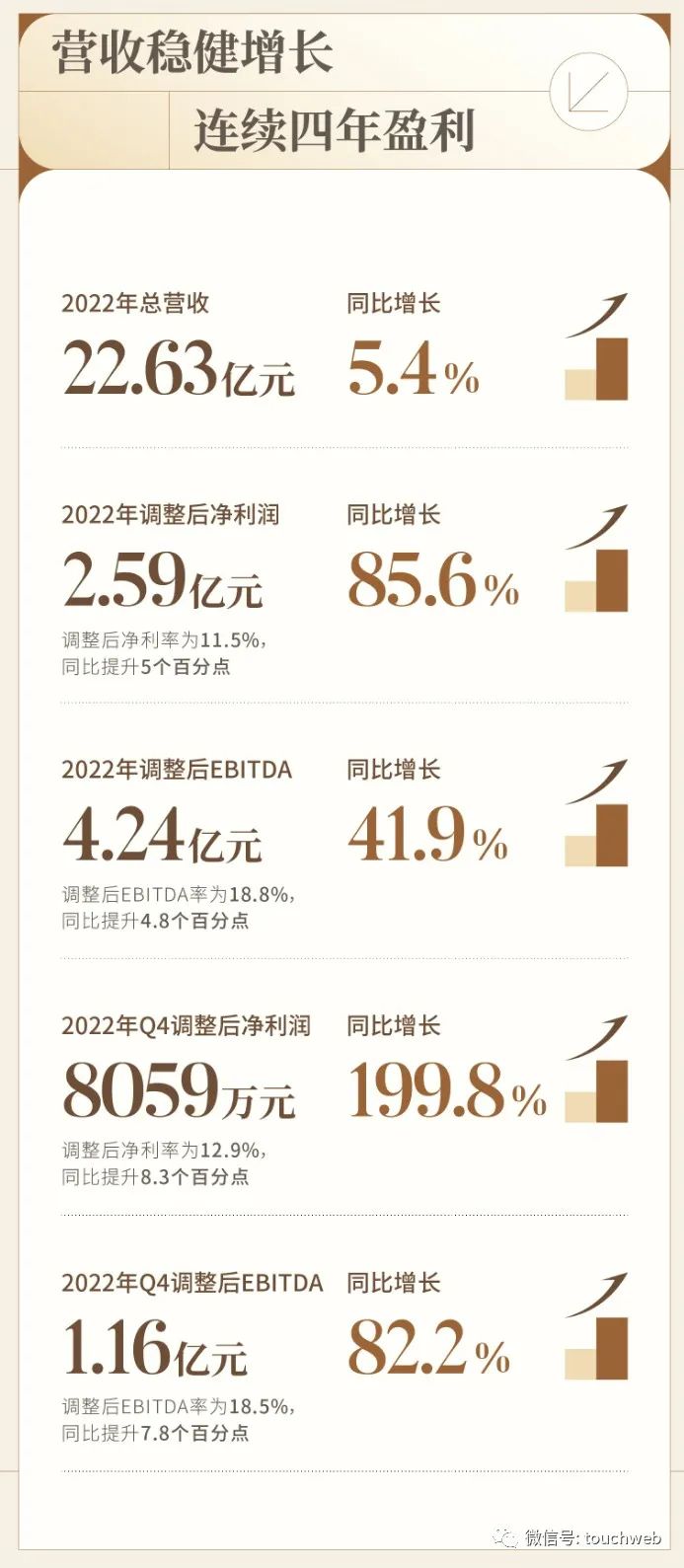 财报显示,亚朵集团2019年到2022年分别实现营业收入15.67亿元、15.67亿元、21.48亿元及22.63亿元,年复合增长率达13%;调整后净利润分别为6100万元、3800万元、1.4亿元和2.59亿元,连续四年保持盈利。
