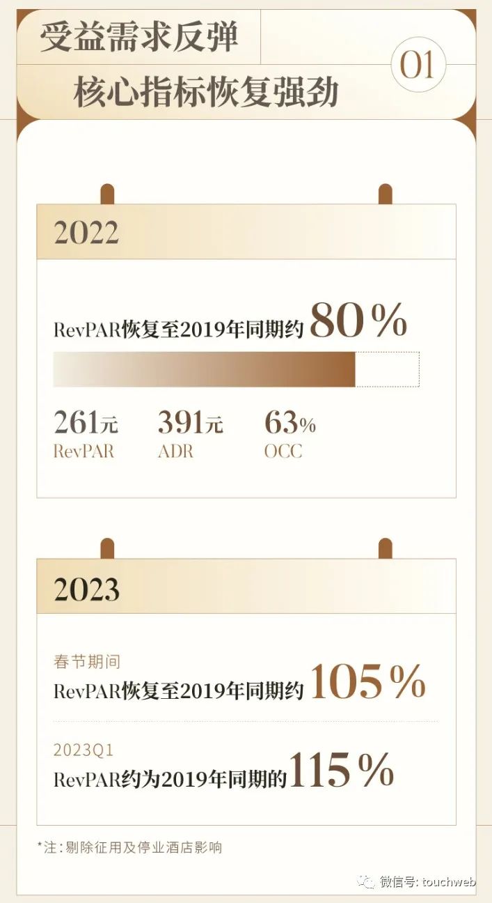 亚朵集团2022年全年RevPAR(平均可出租客房收入)已恢复至2019年约80%的水平。随着国内出行和住宿需求快速反弹、消费回暖,亚朵集团兔年春节7天假期间的RevPAR已恢复至2019年同期水平的105%,预计2023年第一季度整体RevPAR将达到2019年同期的115%。