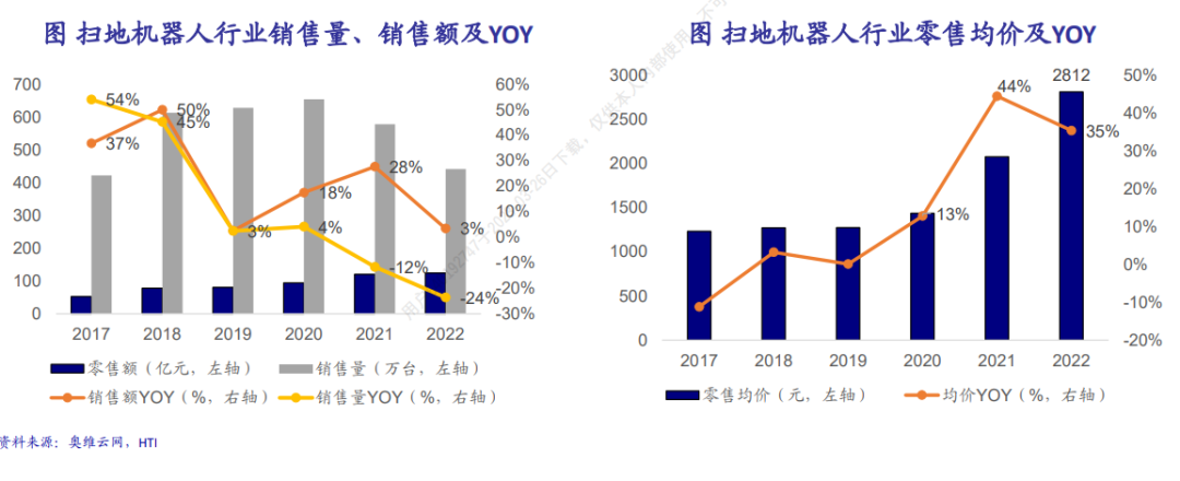 过去两年,扫地机器人销量逐渐下滑,销售额却在快速增长:据奥维云网数据,2022年销量同比-24%至441万台,而销售额同比增长3%。二者增长差异的背后是,均价的大幅提升:2021年行业均价提升44%,2022年行业均价仍同比提升35%至2812元。
