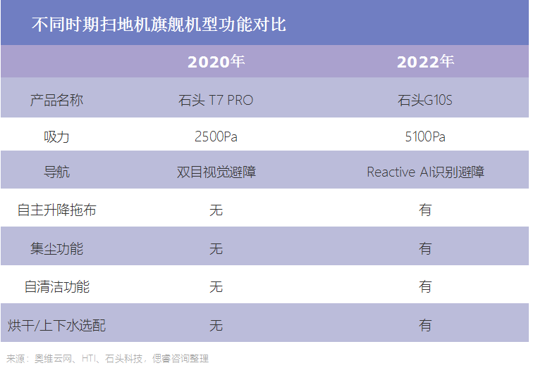 就拿石头科技产品来说,2022年的旗舰产品相较于2020年,基础功能性能翻倍,功能多样:多了自主升降拖布、集尘功能、自清洁功能、烘干/上下水等多个优化体验的功能。