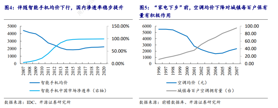 (智能手机、空调均价与渗透率变化情况 图源:开源证券研究所)