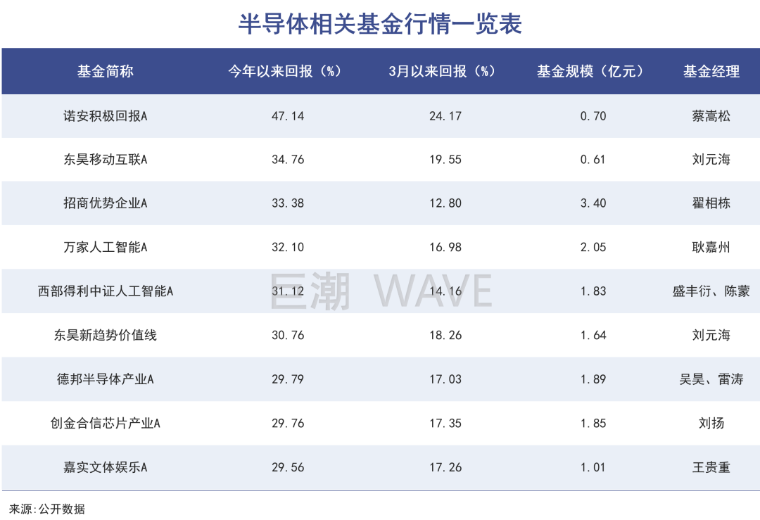 不只是蔡嵩松,其他专注投资半导体的基金经理们也在这段时间得到了不错的业绩回报,比如刘元海管理的东吴移动互联A今年以来回报率达到34.76%,翟相栋管理的招商优势企业A今年以来回报率达到33.38%。