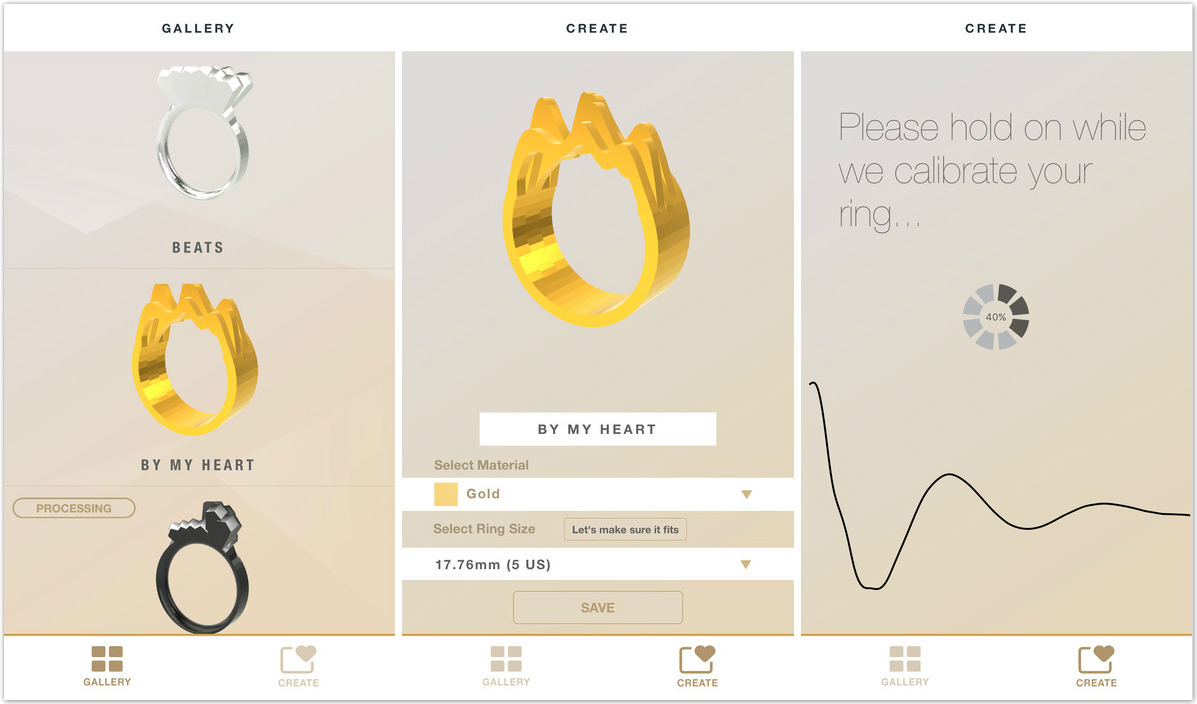 恒美广告(DDB)香港集团最近推出了一个名为“Crafted By My Heart”的戒指定制App,利用时下健身App最喜欢的心率检测技术和3D打印技术,它能把你扑通扑通的心跳纪录下来,刻成一只实实在在的戒指。