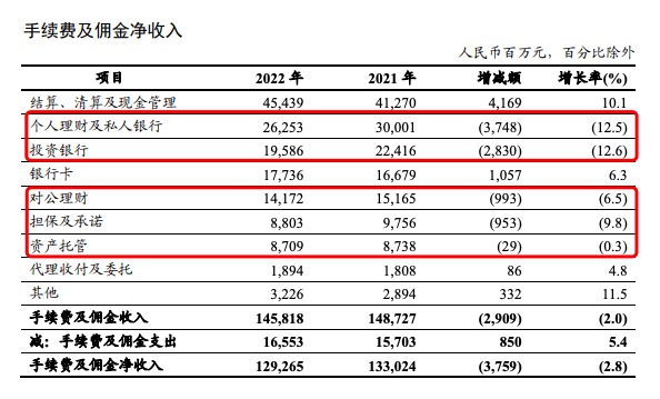 财报显示,工商银行非利息收入由结算、清算及现金管理、个人理财及私人银行、投资银行、银行卡、对公理财、担保及承诺、资产托管、代理收付及委托和其他等项目组成,其中,个人理财及私人银行、投资银行、对公理财、担保及承诺、资产托管等五个项目均呈现同比下降,降幅分别为12.5%、12.6%、6.5%、9.8%和0.3%。