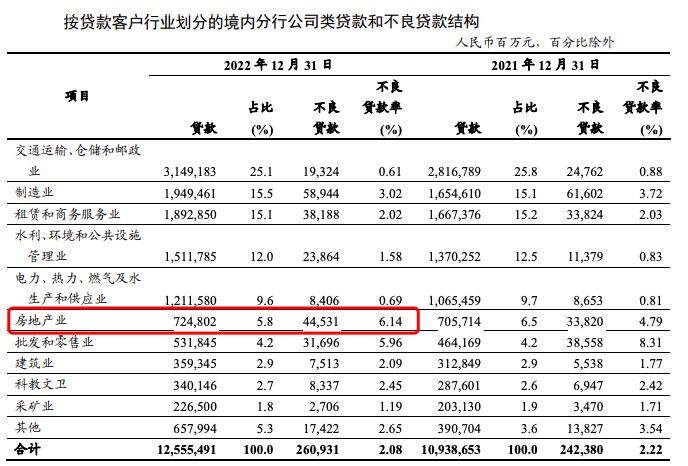在不良贷款率方面,从贷款客户行业划分情况来看,房地产业的不良贷款率最高,为6.14%,较上年末增长1.35%;房地产业的不良贷款余额为445.31亿元,较上年末增加107.11亿元。这也意味着,2022年工商银行不良贷款“双升”。