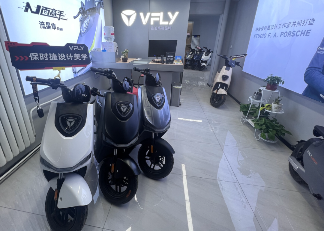 紧接着,2021年,雅迪再推出高端子品牌VFLY,主打与保时捷设计工作室的高端合作,和融合了V-SMART智显大屏、语音助手等在内的人车智联。