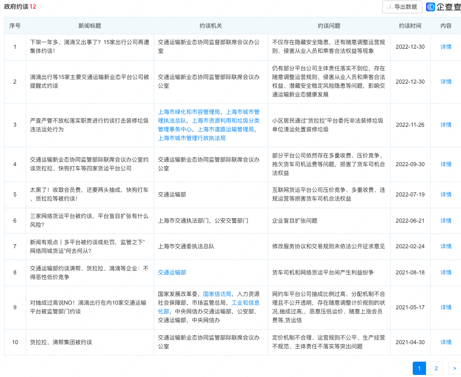 货拉拉对司机的各类行为也收到了严格监管。公开数据显示,2021年至今,货拉拉12次被约谈,约谈问题包括:跟车用户身亡一案;抽成比例过高、分配机制不合理且不公开透明,存在随意调整计价规则的状况、恶意压低运价、随意上涨会员费等;压价竞争、多重收费、违规运营等损害货车司机合法权益;非法客运等。
