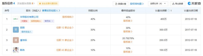 据天眼查,华帝电子成于2012年8月30日,注册资本为1000万元并已经全部实缴。在华帝电子的股权结构中,华帝股份持股40%,吴刚、潘浩标、韩伟分别持有30%、20%、10%股权。另外,华帝电子自其成立起就被纳入华帝股份合并报表范围。