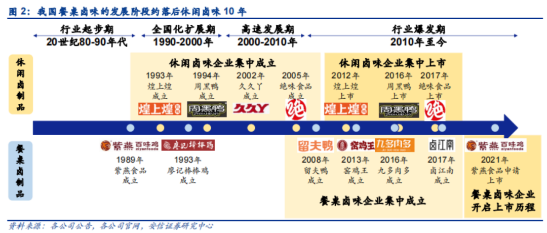 餐桌卤味集中成立于2010年期间,例如紫燕百味鸡、廖记棒棒鸡、窑鸡王等,仅一家紫燕在2022年登陆资本市场,其他品牌一直在保守发展。
