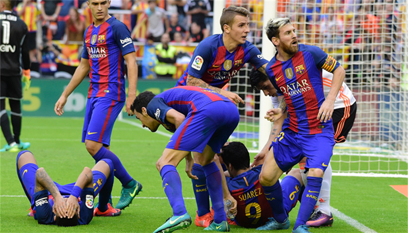 开场不久,瓦伦西亚的凶狠逼抢便让巴萨尝到了苦头。第12分钟,恩佐·佩雷斯背后铲翻伊涅斯塔,痛苦倒地的小白手捂膝盖捶打草皮招呼队医进场治疗。他随后被担架抬下,赛后据初步诊断,伊涅斯塔右膝外侧部分韧带撕裂,将因此会缺席6-8周的时间。然而对于这次凶狠的放铲,名哨马里恩科并未作出任何表示。此后瓦伦西亚球员的动作仍未收敛,MSN组合随后成为了“重点照顾”的对象。