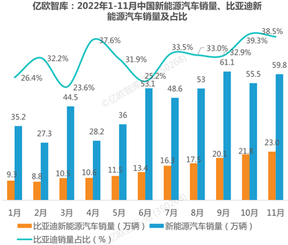 从市场份额上看,去年下半年,比亚迪销售占比维持在30%以上,11月甚至占据近40%的市场份额,成为中国新能源汽车市场的龙头企业。