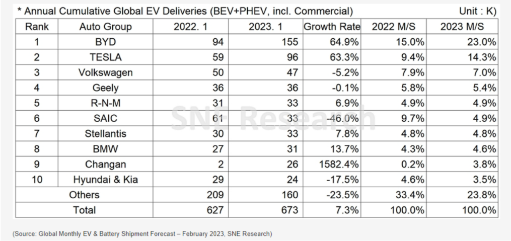 如下图所示,2023年1月全球各国新增销售电动汽车总数约为67.3万辆。比亚迪、特斯拉分别交付15.5万辆、9.6万辆,分别保持64.9%、63.3%的同比增速。从1月的数据看,比亚迪拿下23%的市场份额,高于特斯拉的14.3%。