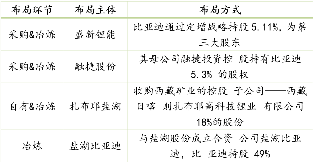 2017年,比亚迪与盐湖股份成立合资公司盐湖比亚迪,比亚迪持股49%,计划投建3万吨/年碳酸锂项目,目前中试工作整体进展顺利,已经生产出合格碳酸锂产品。