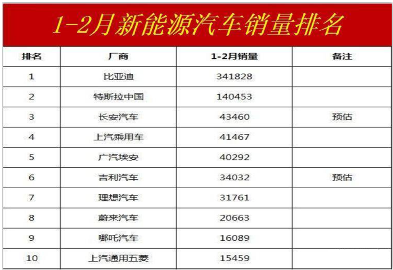 另外,根据乘联会公布的数据,今年1-2月比亚迪汽车在中国的累计销量突破了34万辆,稳居榜首。特斯拉以14万辆位居第二。