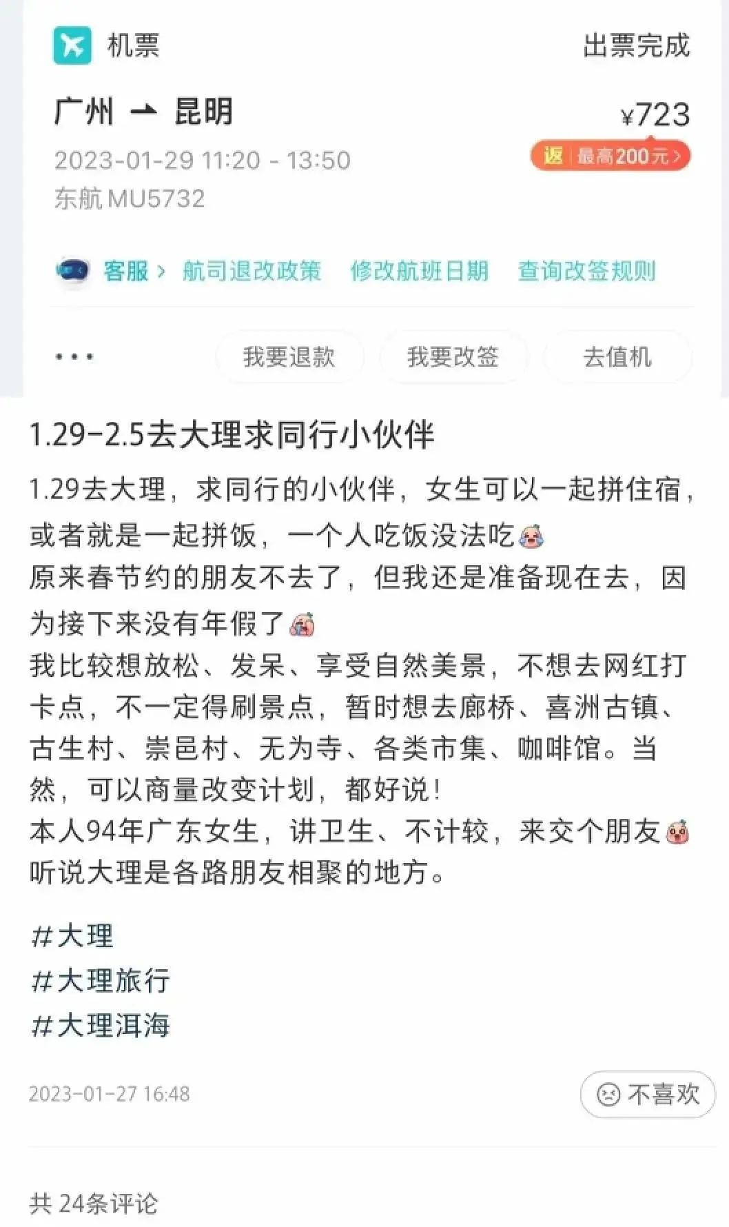 考虑退票还要扣钱,我决定还是按原计划去大理。但想到一个人玩既无聊费用又太高,连吃饭都不能多点几道菜后,我开始在某个社交平台上发帖找“旅行搭子”。