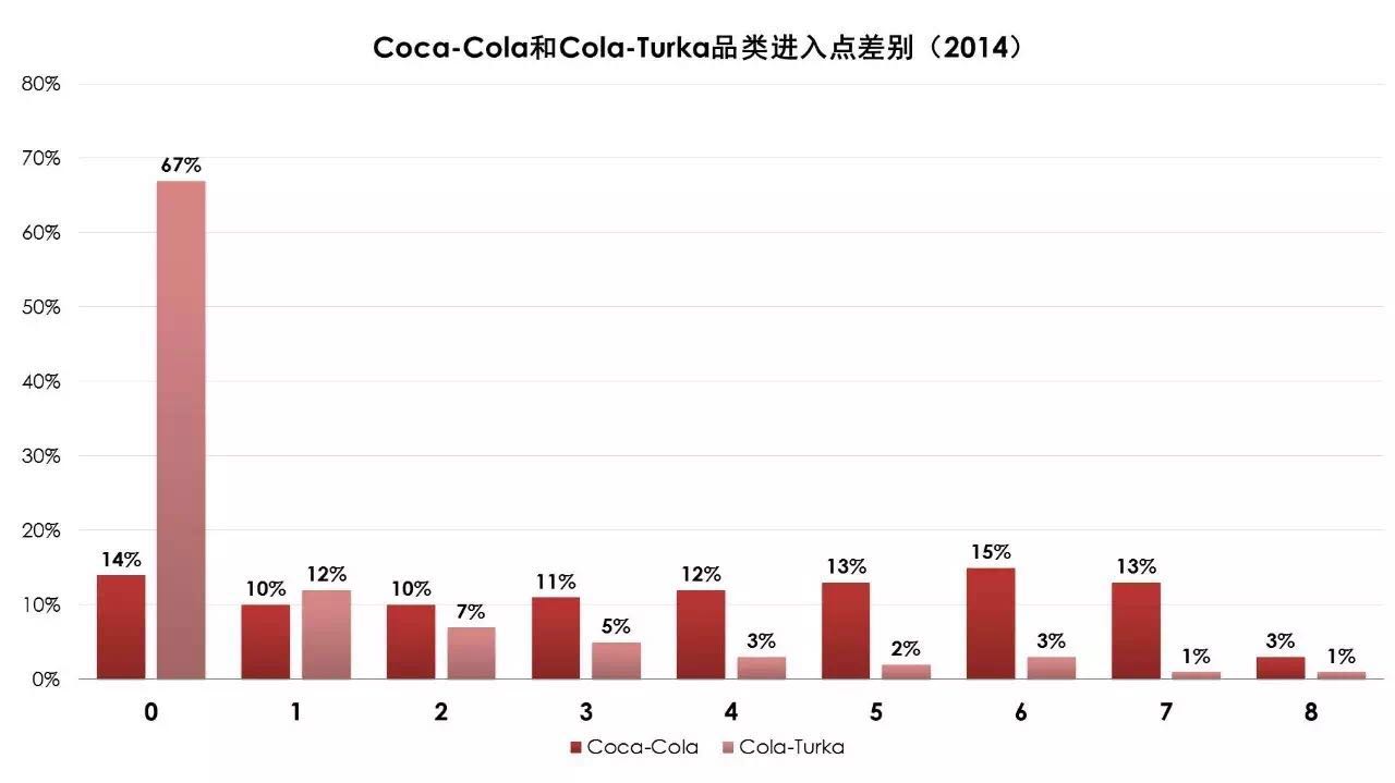 我们可以看出,有67%的消费者,不能把Cola-Turka和8个中任何一个品类进入点主动联系在一起,对Coca-Cola这个数字只有14%。
