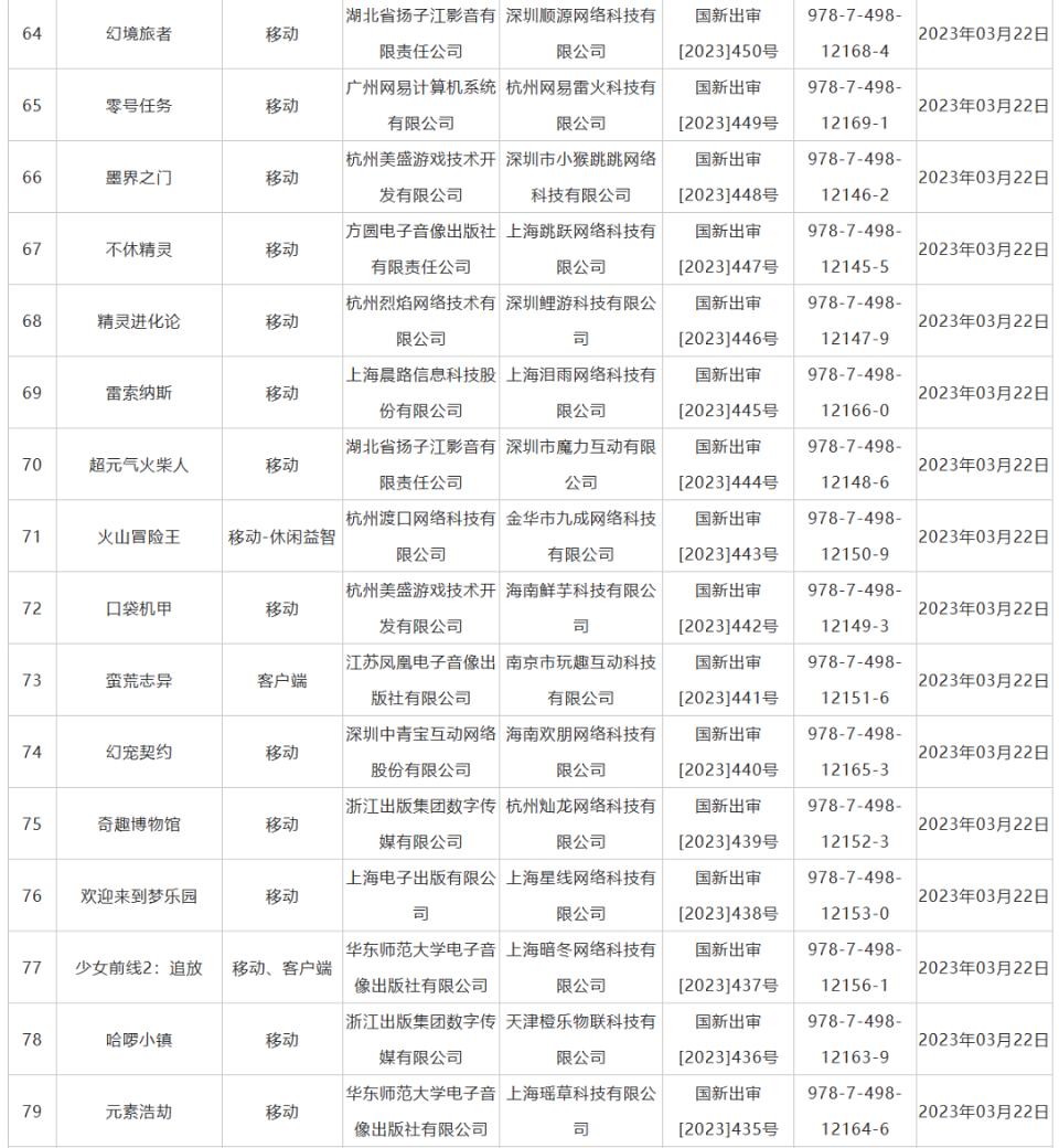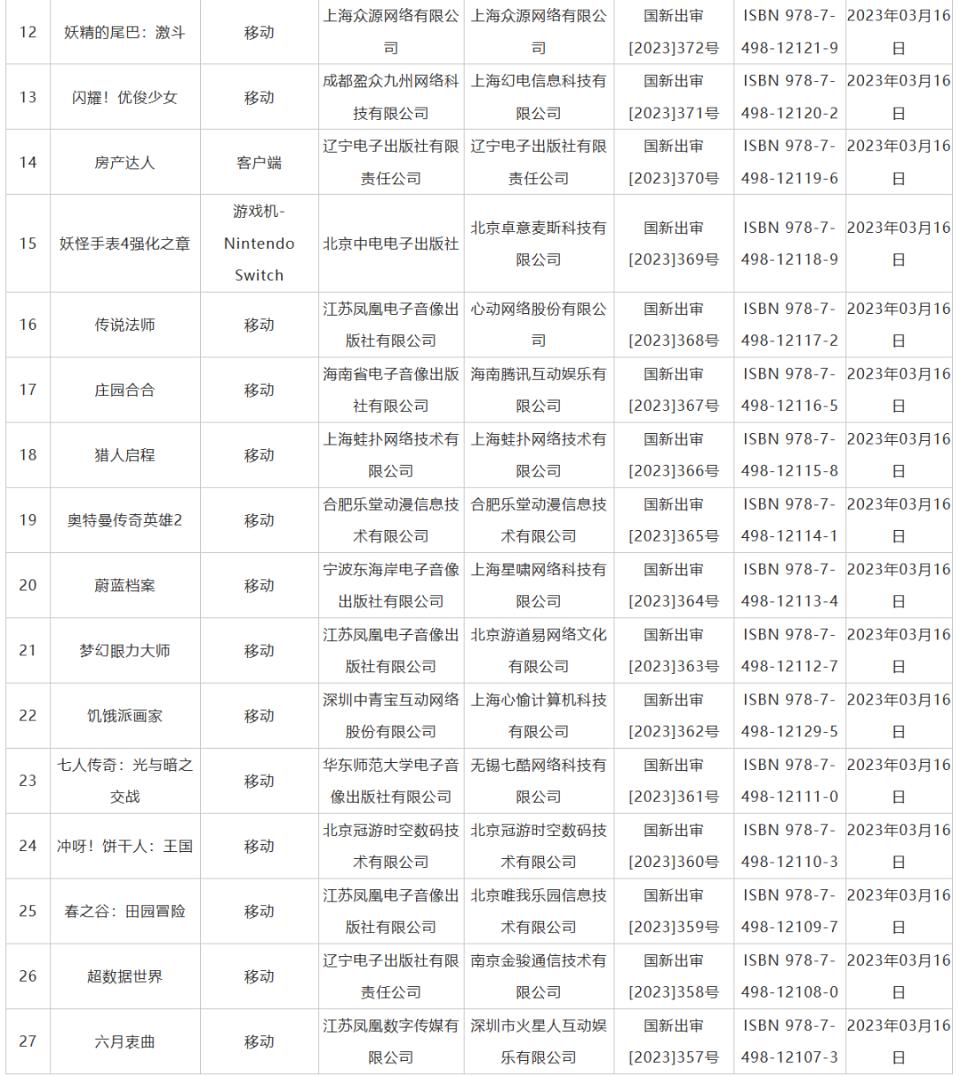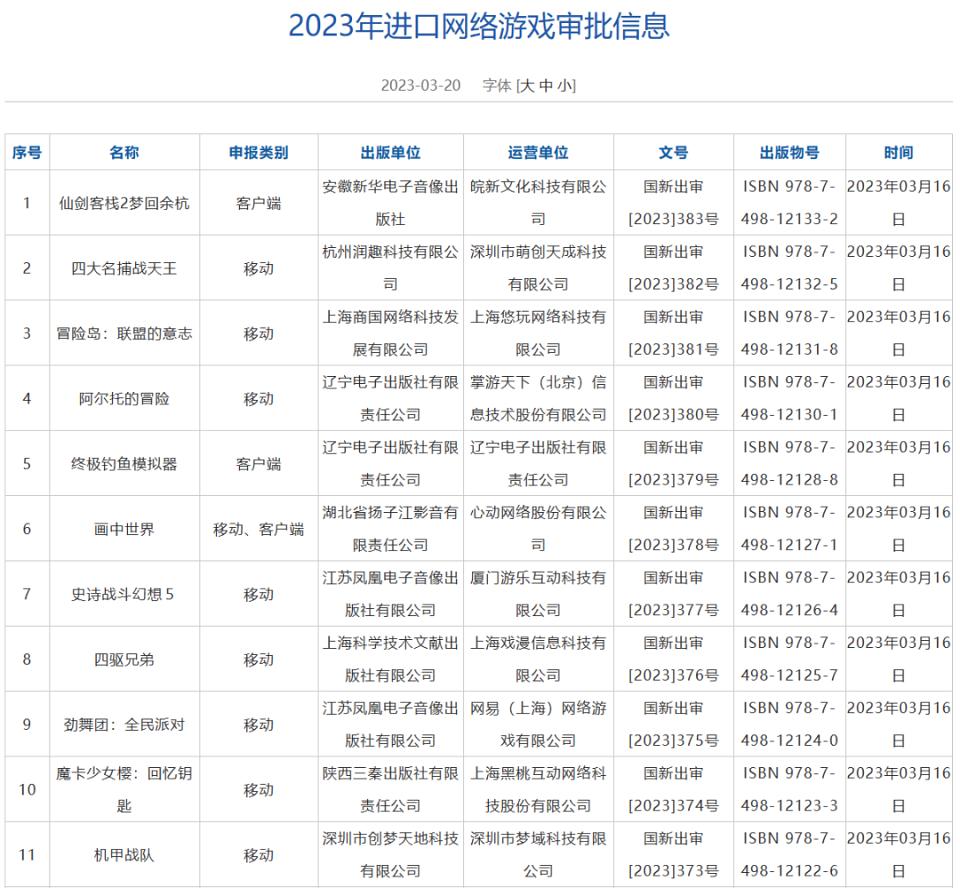 不仅如此,3月还另外下发了一批进口游戏版号,共27个,包括《冒险岛:联盟的意志》《劲舞团:全民派对》《传说法师》《妖怪手表4强化之章》等。离2022年进口游戏版号下发仅过3个月,本月就又迎来了2023年度的进口游戏版号,这同样对行业信心有提振作用。