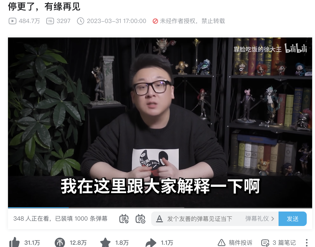 在停更的话题冲上微博热搜后,“徐大王”于4月2日发布微博称,停更属于个人原因,与B站无关。“LKs”在微博表示,“仅代表个人宣布我停更和经济情况无关,今年在B站收入也不比以前少。”