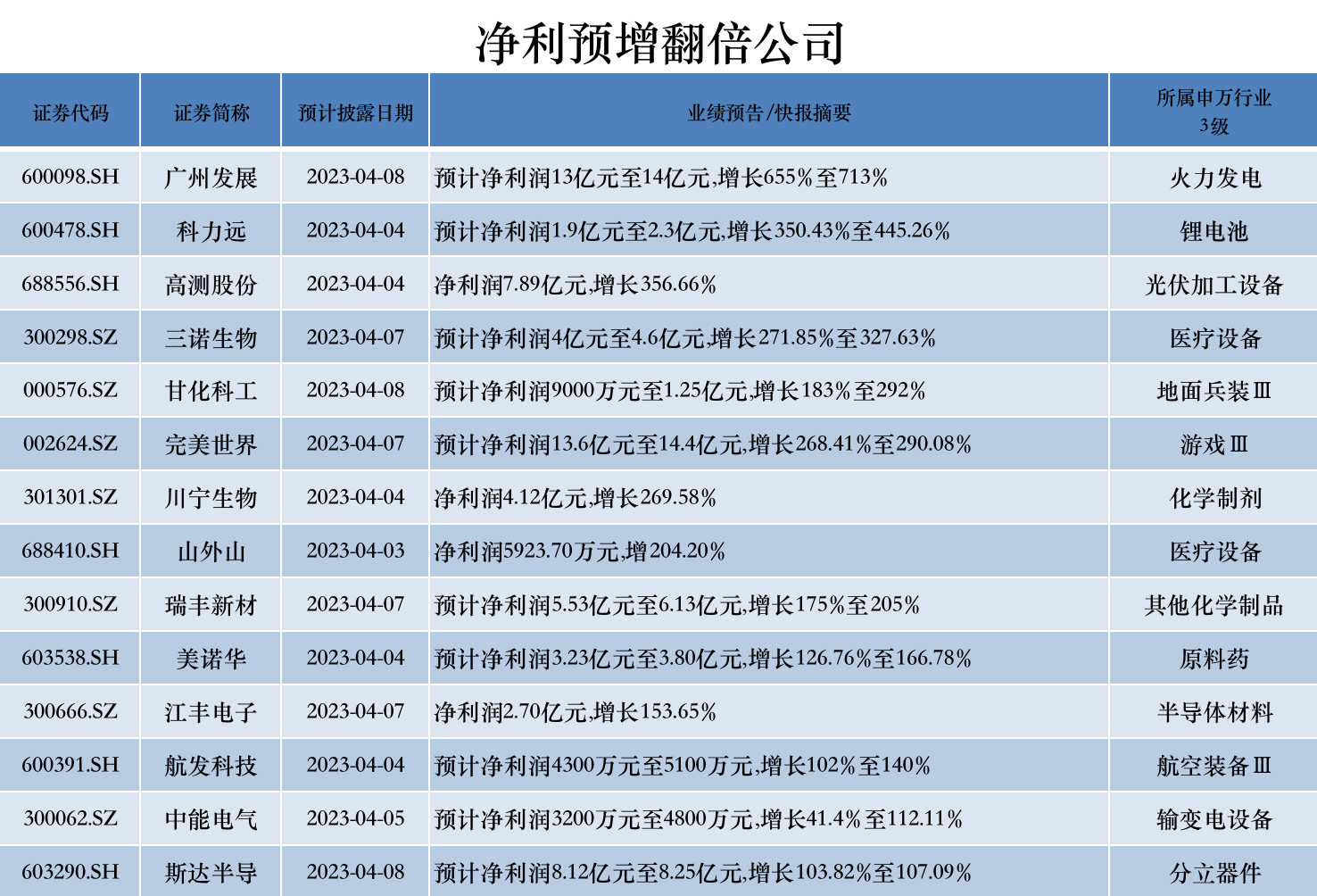 预计净利润增长翻倍的公司有14家,多数因主营业务向好实现业绩高增长,也有部分系因前期可比基数较低。