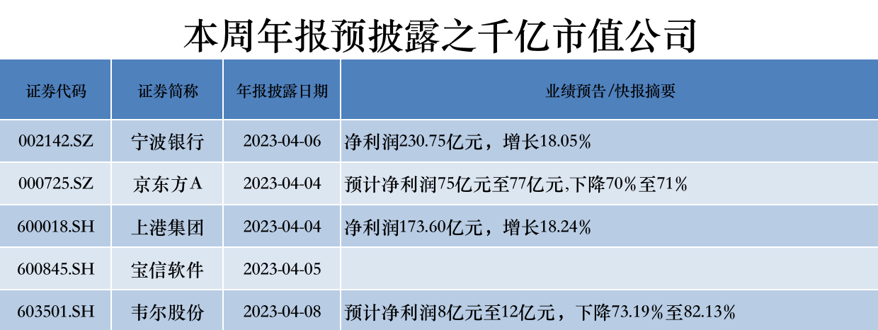 本周,至少5家千亿市值公司披露年报,分别为宁波银行(002142.SZ)、京东方A(000725.SZ)、上港集团(600018.SH)、宝信软件(600845.SH)、韦尔股份(603501.SH)。