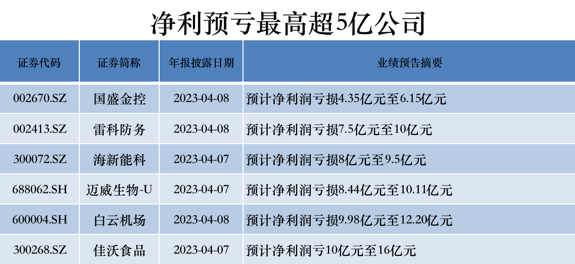 值得注意的是,本周披露年报的公司中有6家预计净利润最高亏损超5亿元,分别为国盛金控(002670.SZ)、雷科防务(002413.SZ)、海新能科(300072.SZ)、迈威生物-U(688062.SH)、白云机场(600004.SH)、佳沃食品(300268.SZ)。